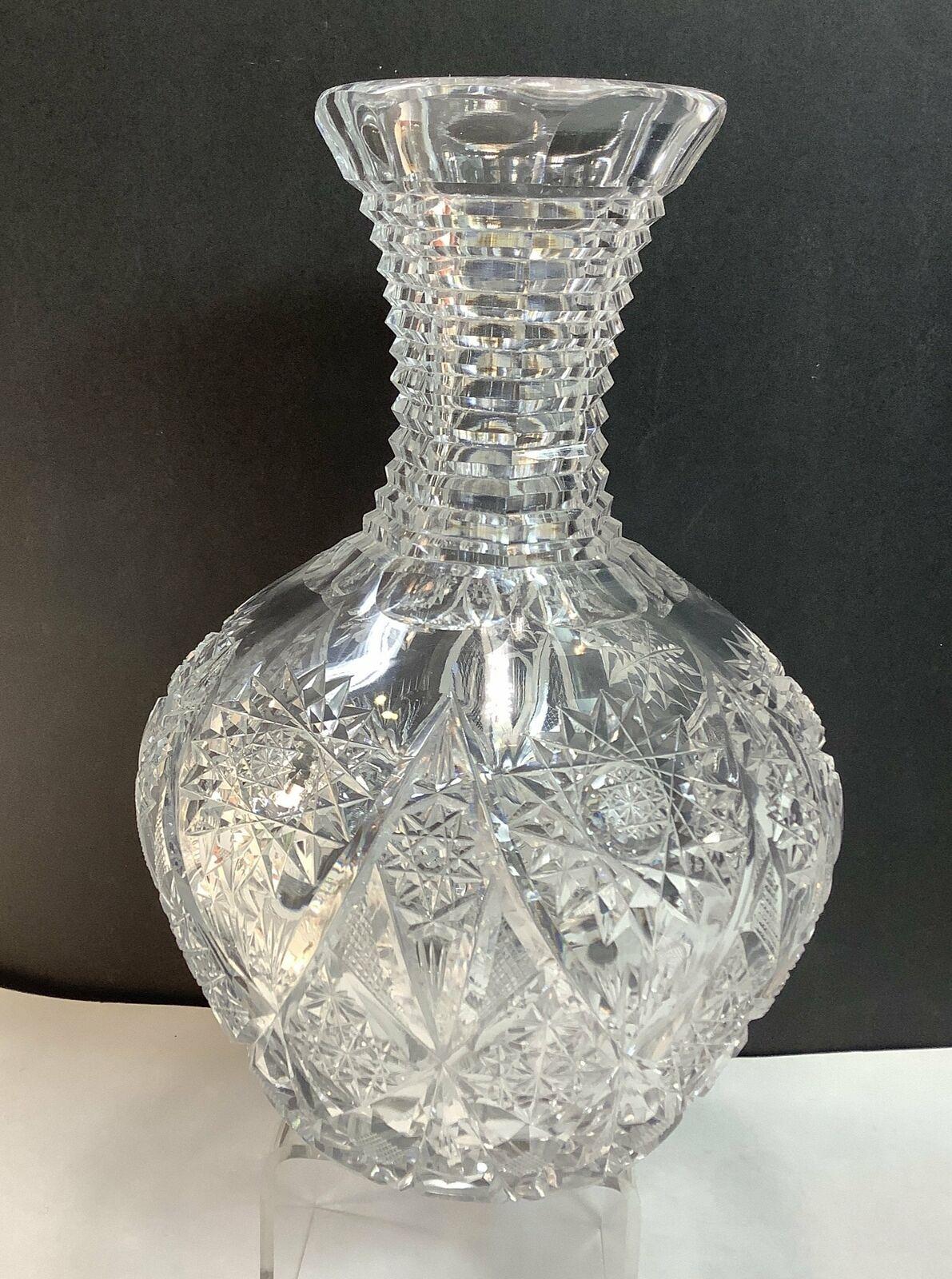 ABP cut glass carafe is 7.75 high and weighs 3.5 lbs. Blank is water clear. The carafe is in great condition. No chips cracks or cloudiness.