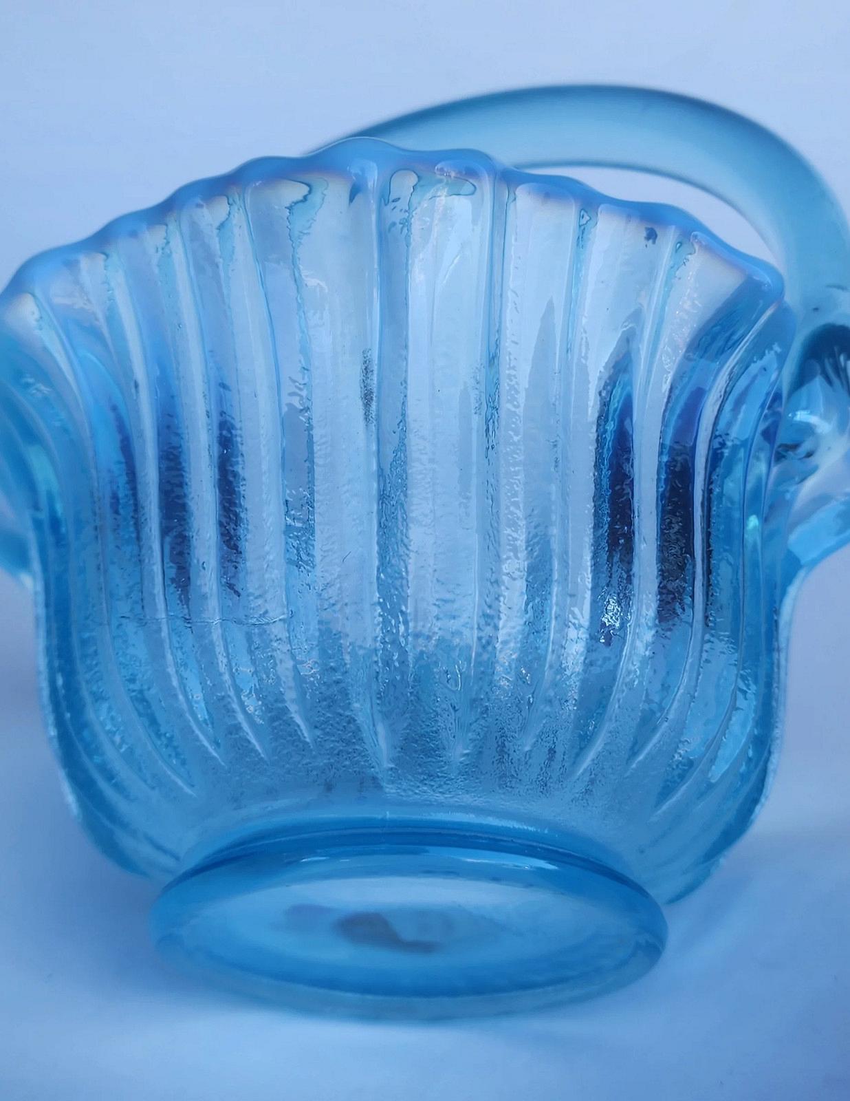 L.E Smith Glass blue opalesc scoloped ribbed basketL.E Smith Glass blue opalesc scoloped ribbed basketL.E Smith Glass blue opalesc scoloped ribbed basketL.E Smith Glass blue opalesc scoloped ribbed basket