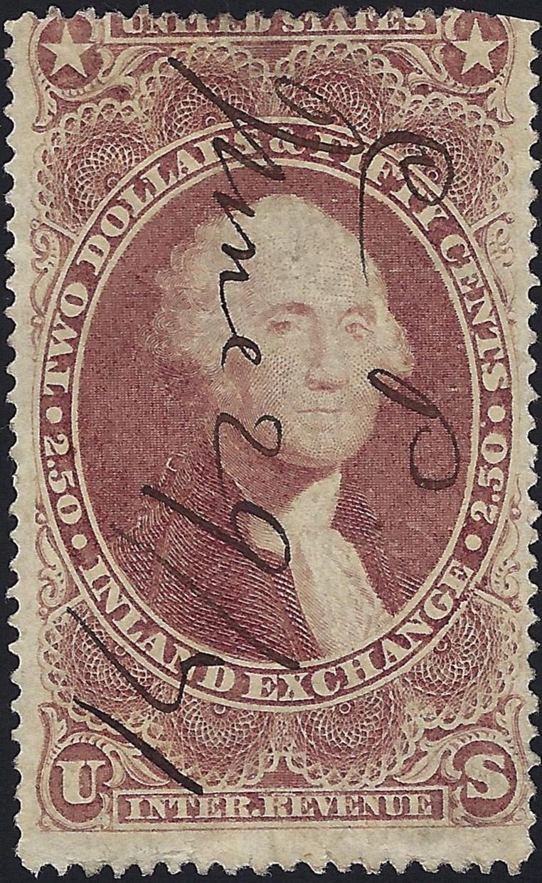 The product is a US Scott #R84C Used $2.50 1871 Inland Exchange Revenue Stamp with a catalog value of $22.50. This stamp was issued in the United States in 1871 and features a historical figure theme. The cancellation type is a pen cancel, and the stamp is uncertified. A desirable piece for collectors interested in back of book stamps and US historical figures.